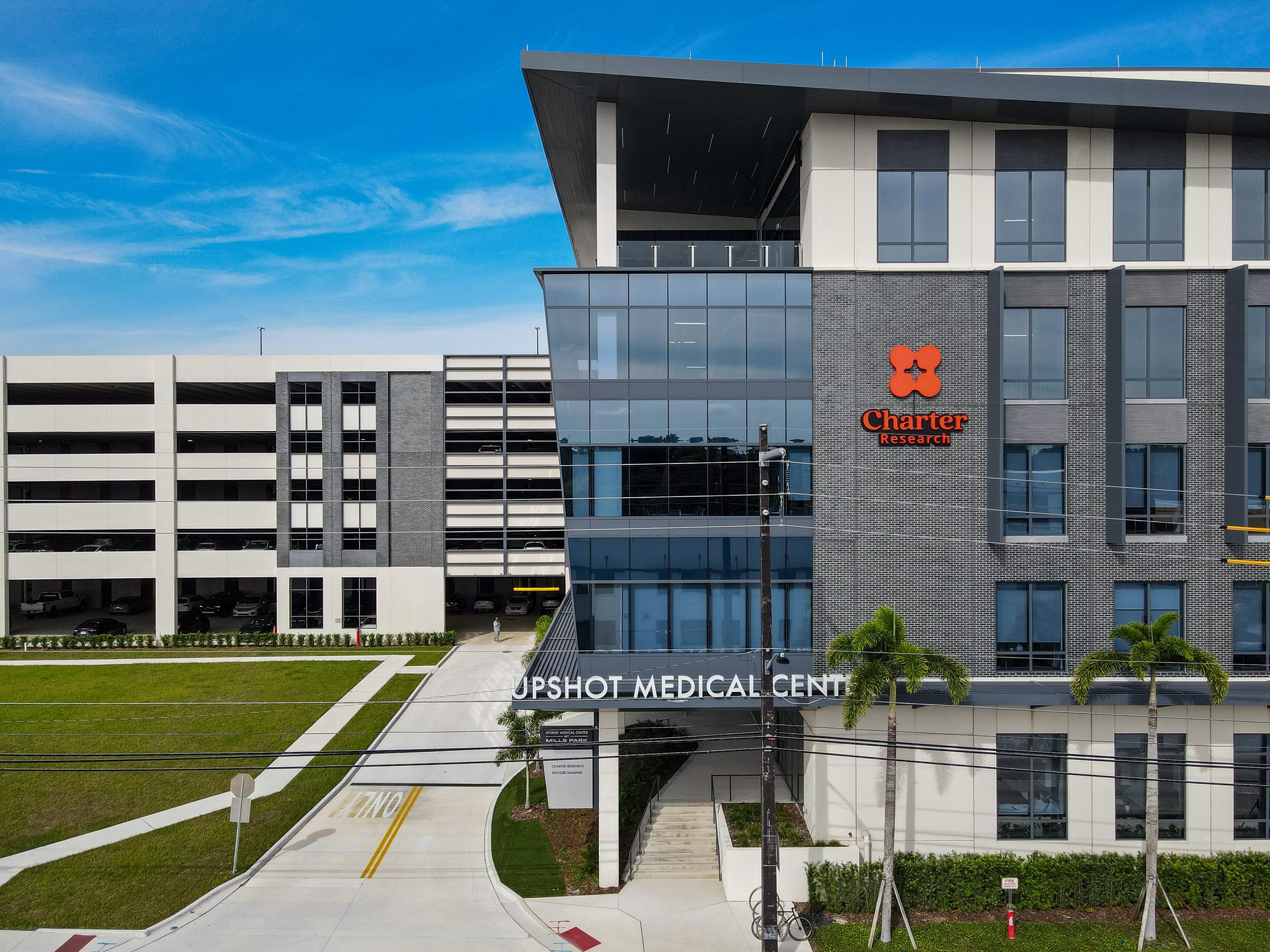 - Drive into the Charter Research parking garage .